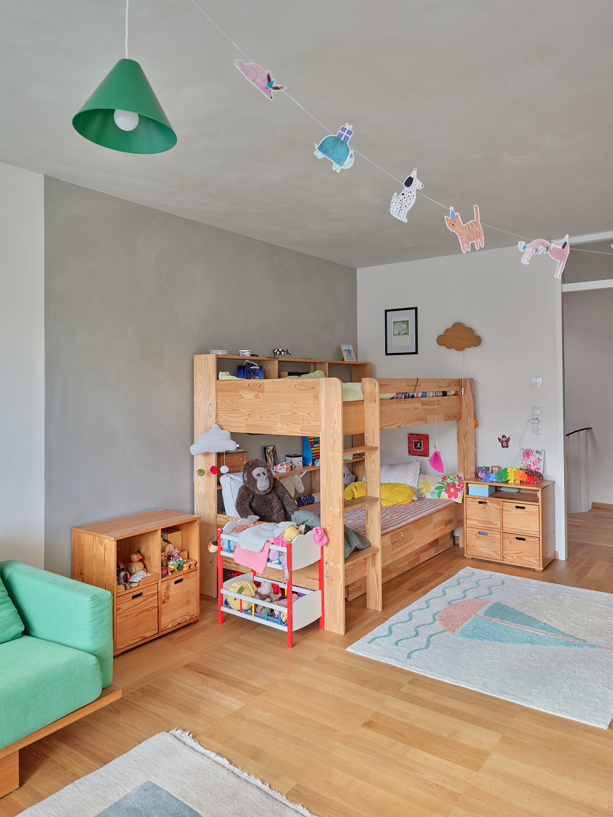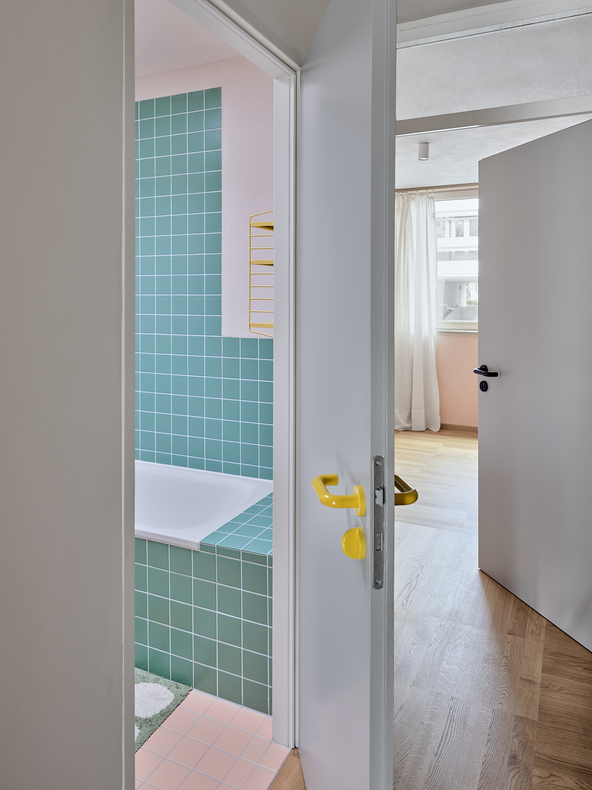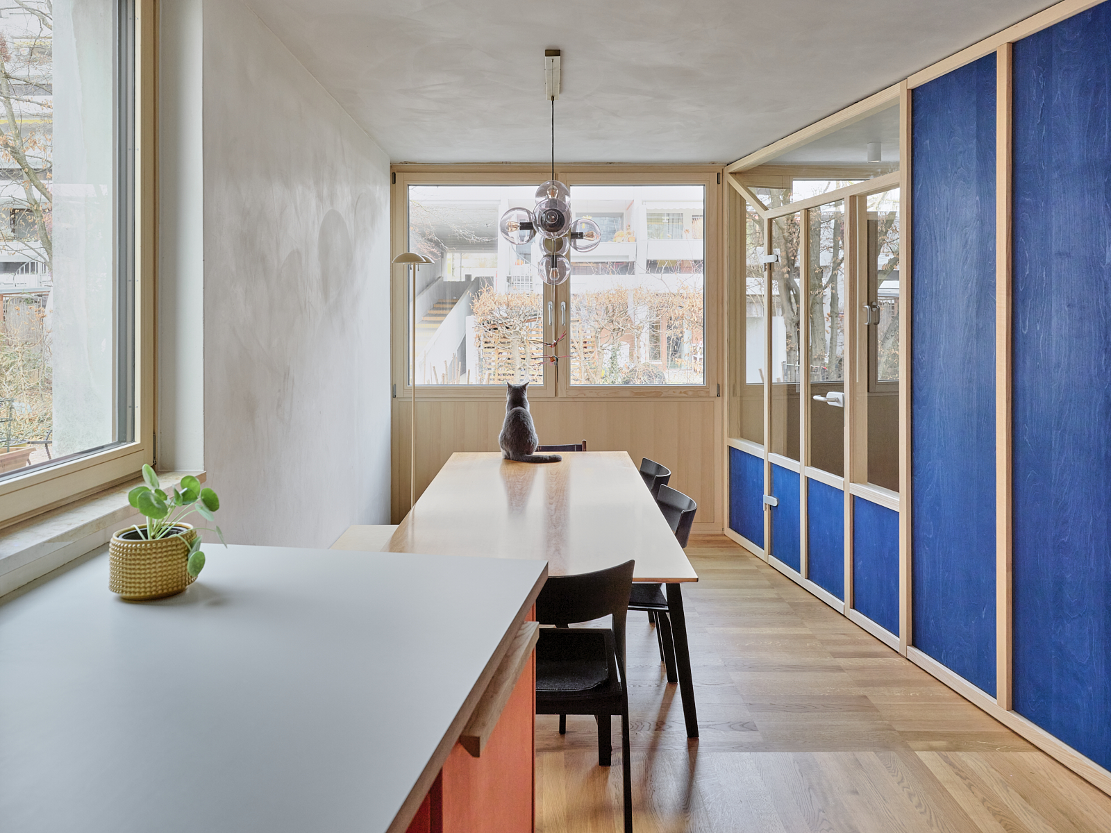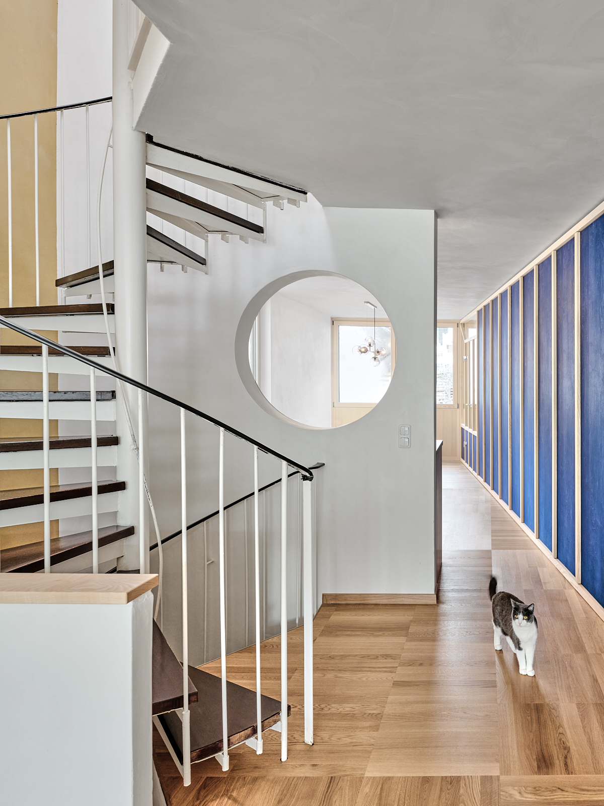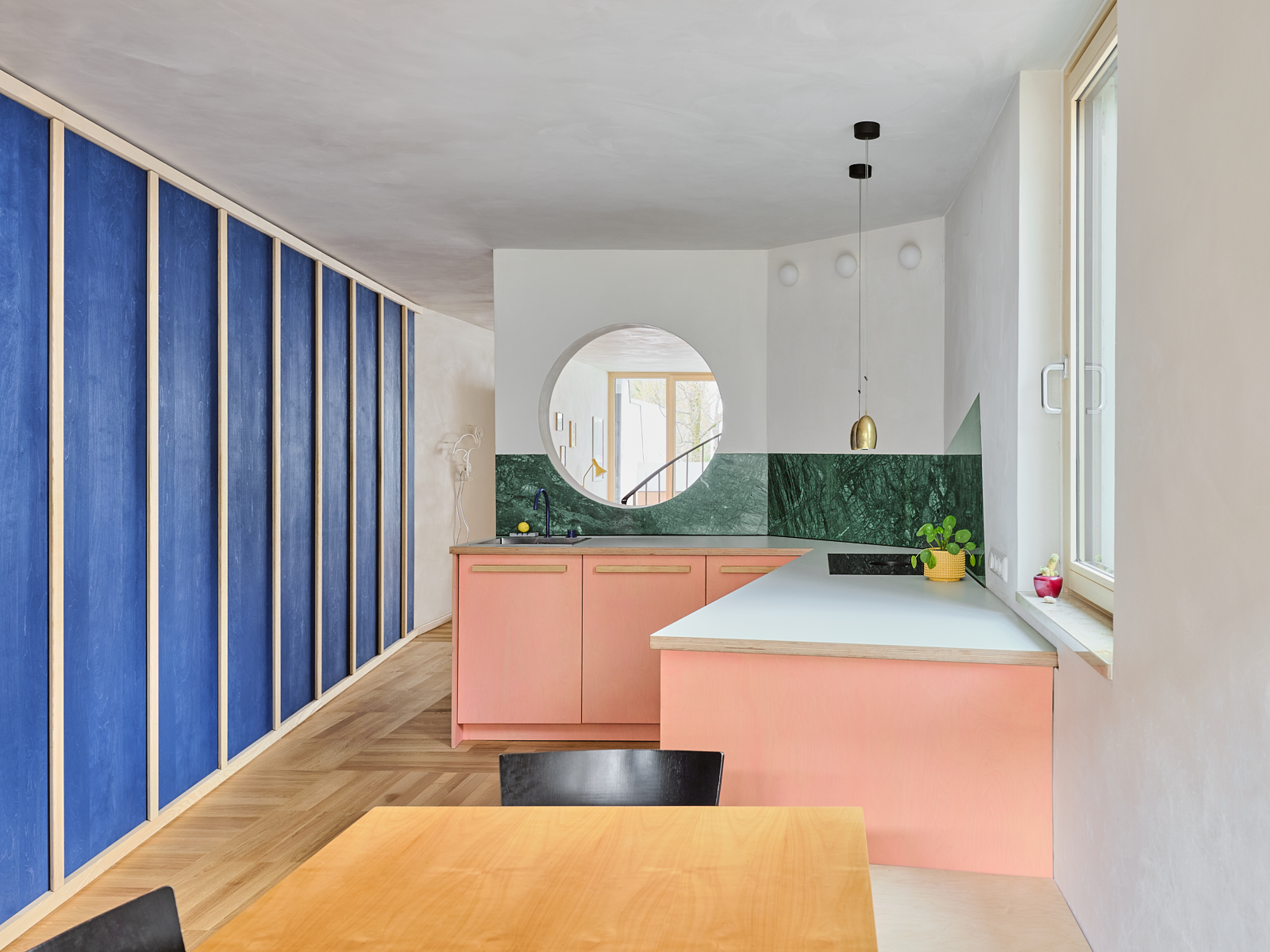 Das für die Olympischen Sommerspiele 1972 erbaute Olympische Dorf in München ist heute ein beliebtes Wohngebiet, das 1998 unter Denkmalschutz gestellt wurde. Eines der Reihenhäuser in der Anlage war Gegenstand eines von den 1970er Jahren inspirierten Renovierungsprojekts von birdwatching architects. Alle Trennwände wurden entfernt, um Licht und ein Gefühl von Geräumigkeit in den Raum zu bringen. Diese Wirkung wird durch die Integration eines dreieckigen Eingangsbereich und eines asymmetrischen Eichenparkettbodens, der sich durch den gesamten Raum zieht, noch verstärkt. Die Farbpalette ist eine typische Kombination aus den 70er Jahren mit tiefen Grün-, Rosa- und Blautönen und taktilen Lehmputzwänden, die spielerisch an dieses Jahrzehnt erinnern und eine helle, luftige und farbenfrohe Umgebung schaffen, die dem zeitgenössischen Lebensstil entspricht.