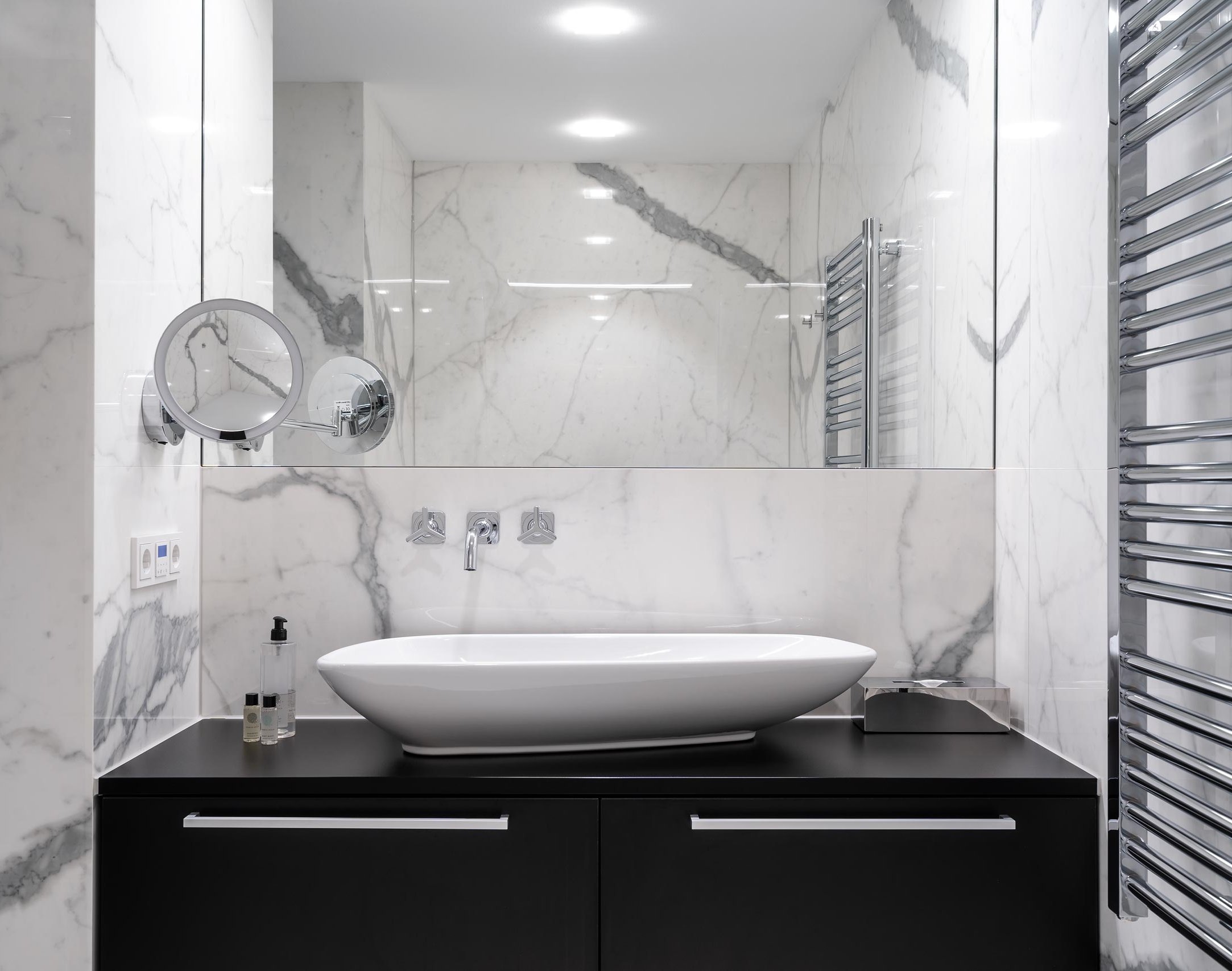 In der Suite My Way findet sich zum Beispiel ein SaphirKeramik-Waschtisch aus der mehrfach designpreis-gekrönten Kollektion „Val“, der das Potenzial zum modernen Klassiker hat. Designer Konstantin Grcic hat mithilfe der SaphirKeramik von LAUFEN einen schlichten Waschtisch kreiert, dessen zarte Wandungen die Raumwirkung verfeinern.