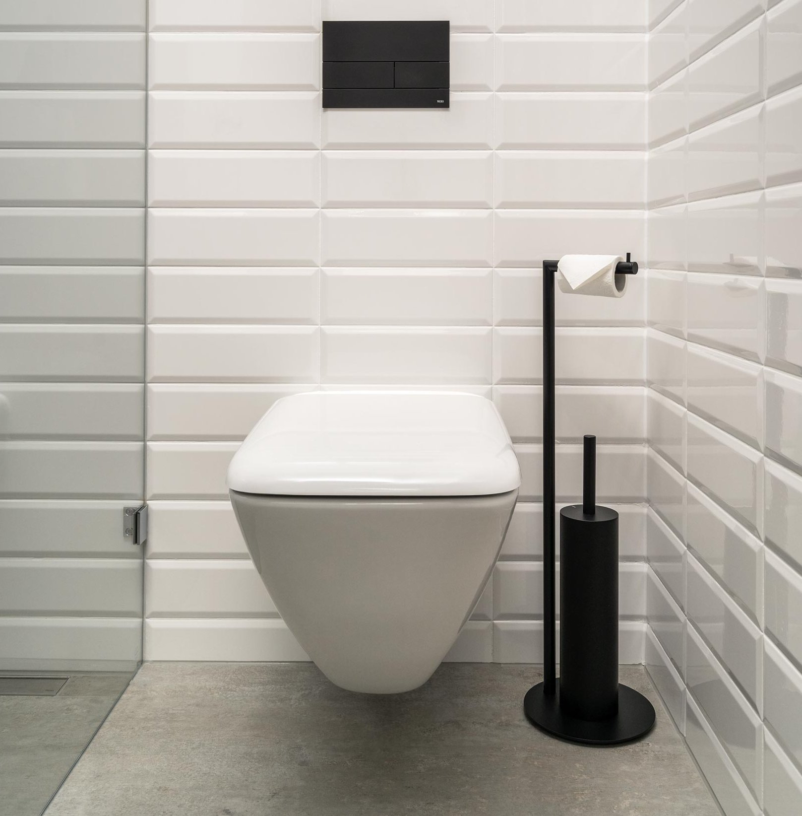 Eine fast gegensätzliche Aufgabe erfüllt das WC aus der Kollektion Palace in der Suite Evergrins. Hier geht die organische, abgerundete Form zwar eine Verbindung mit weiteren runden Elementen des schwarz-weiß gehaltenen Bades ein, nimmt sich jedoch dank der weißen Farbe und einer sich nach unten verjüngenden Gestalt innerhalb der offenen Raumarchitektur dezent zurück. Vor dem Hintergrund der weißen Fliesen wirkt es leicht, ja nahezu transparent.