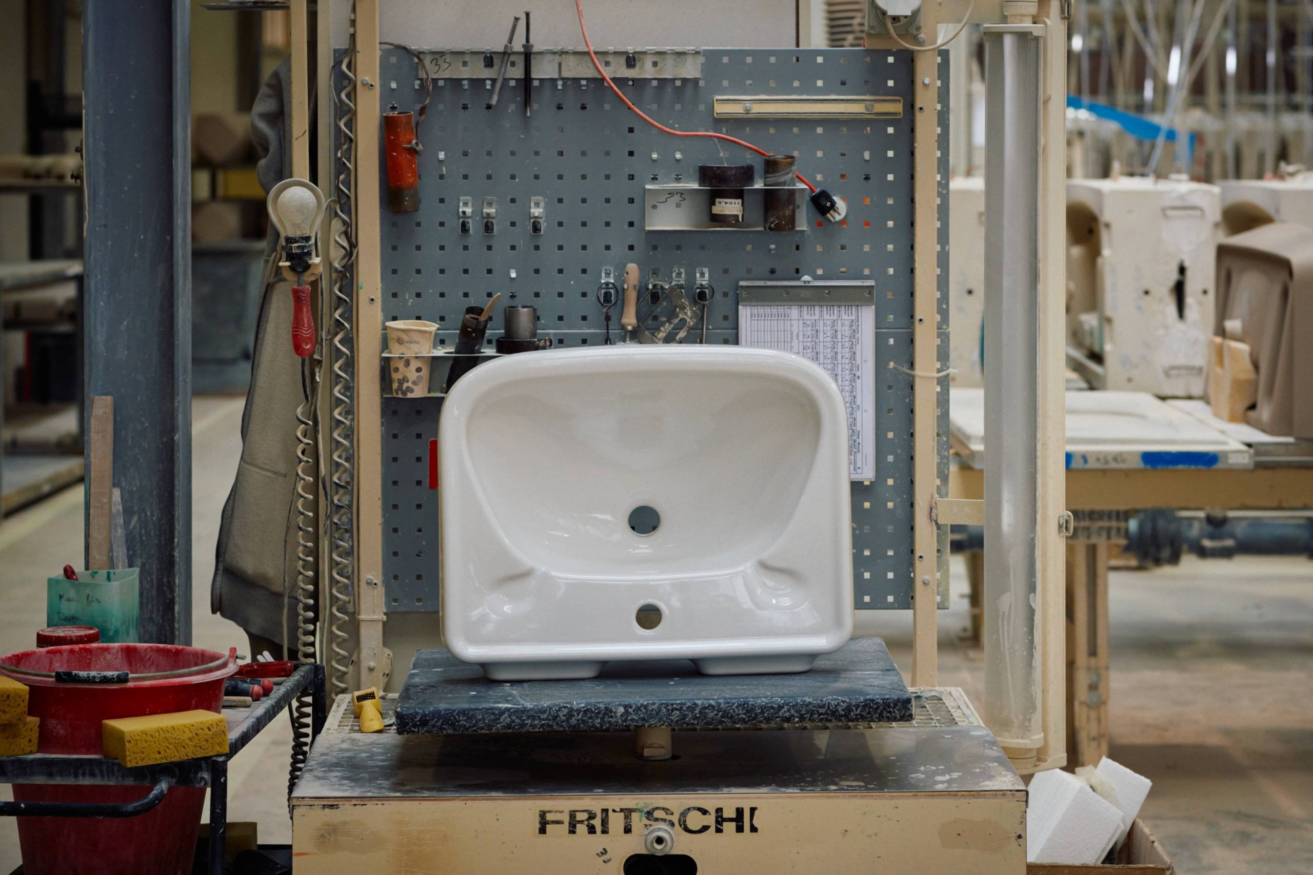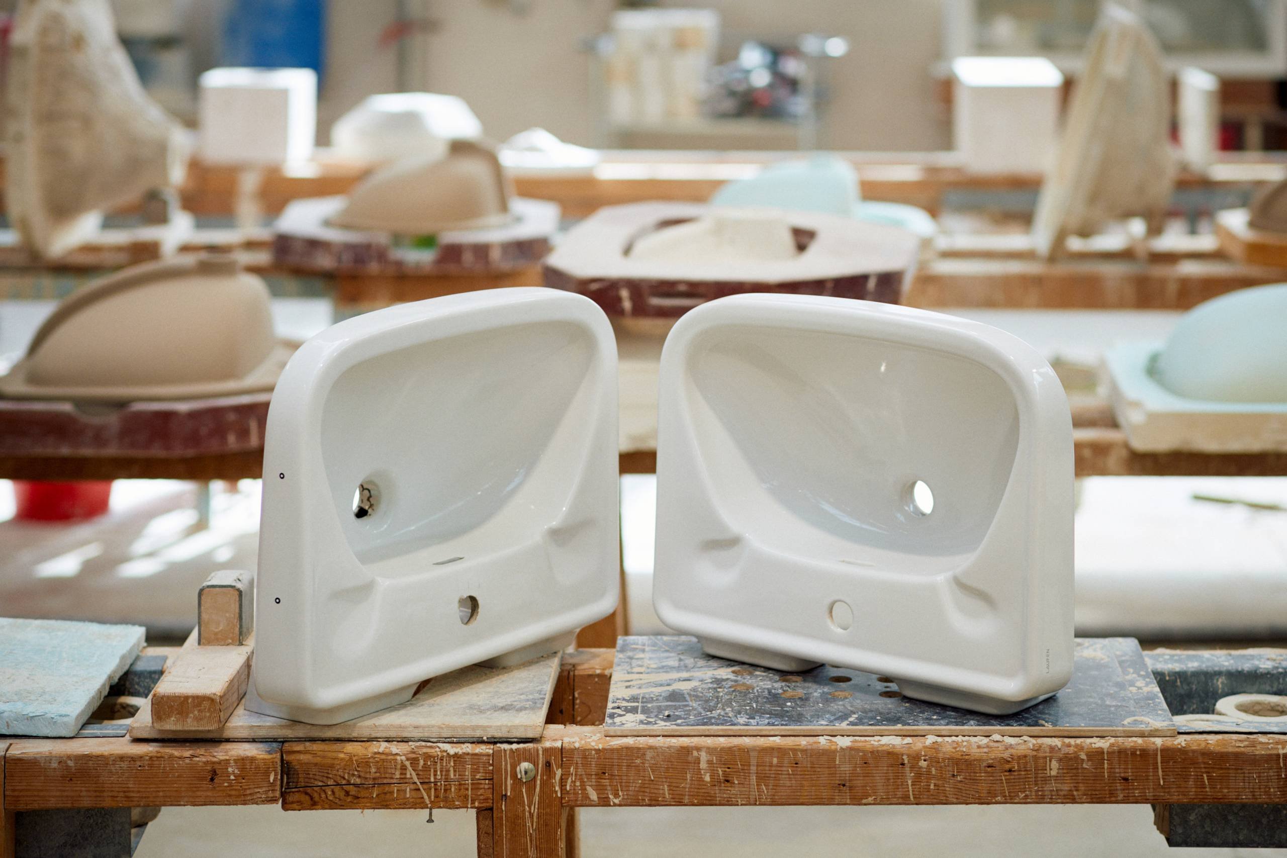 Für die Nachbildung bekam LAUFEN eines der Waschbecken aus der Neuen Nationalgalerie als Muster gestellt. Dieses Original wurde gescannt, in ein 3D-Konstruktionsmodell umgewandelt und nach hochkomplexen Berechnungen in zwei Gipsblöcke gefräst, um neue Formhälften zu erhalten. Die Berechnungen sind die eigentliche Herausforderung, denn um einen Waschtisch in exakt der gleichen Größe und Form herzustellen, genügt es nicht, einen einfachen Abguss in gleicher Größe von einem Muster abzunehmen.