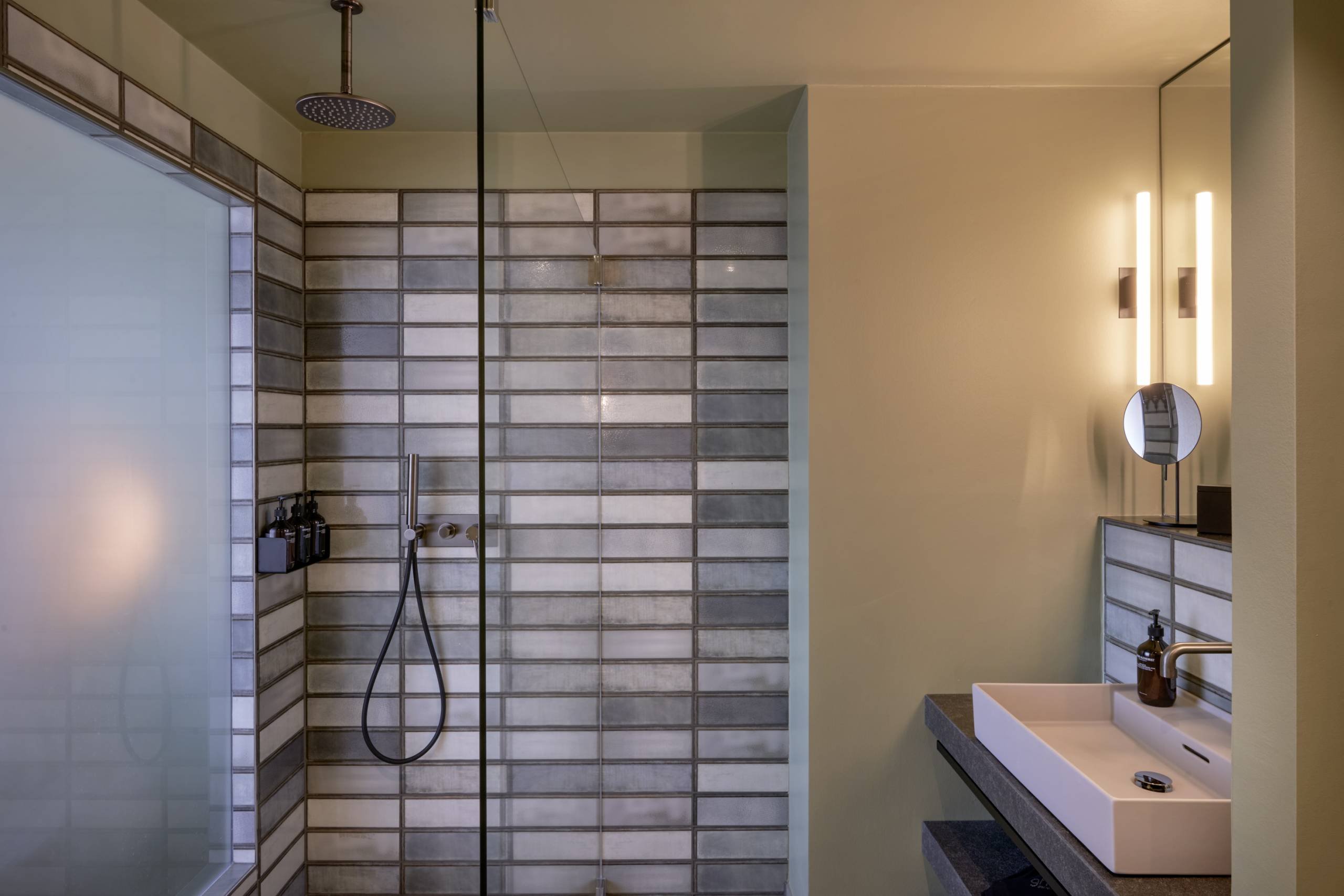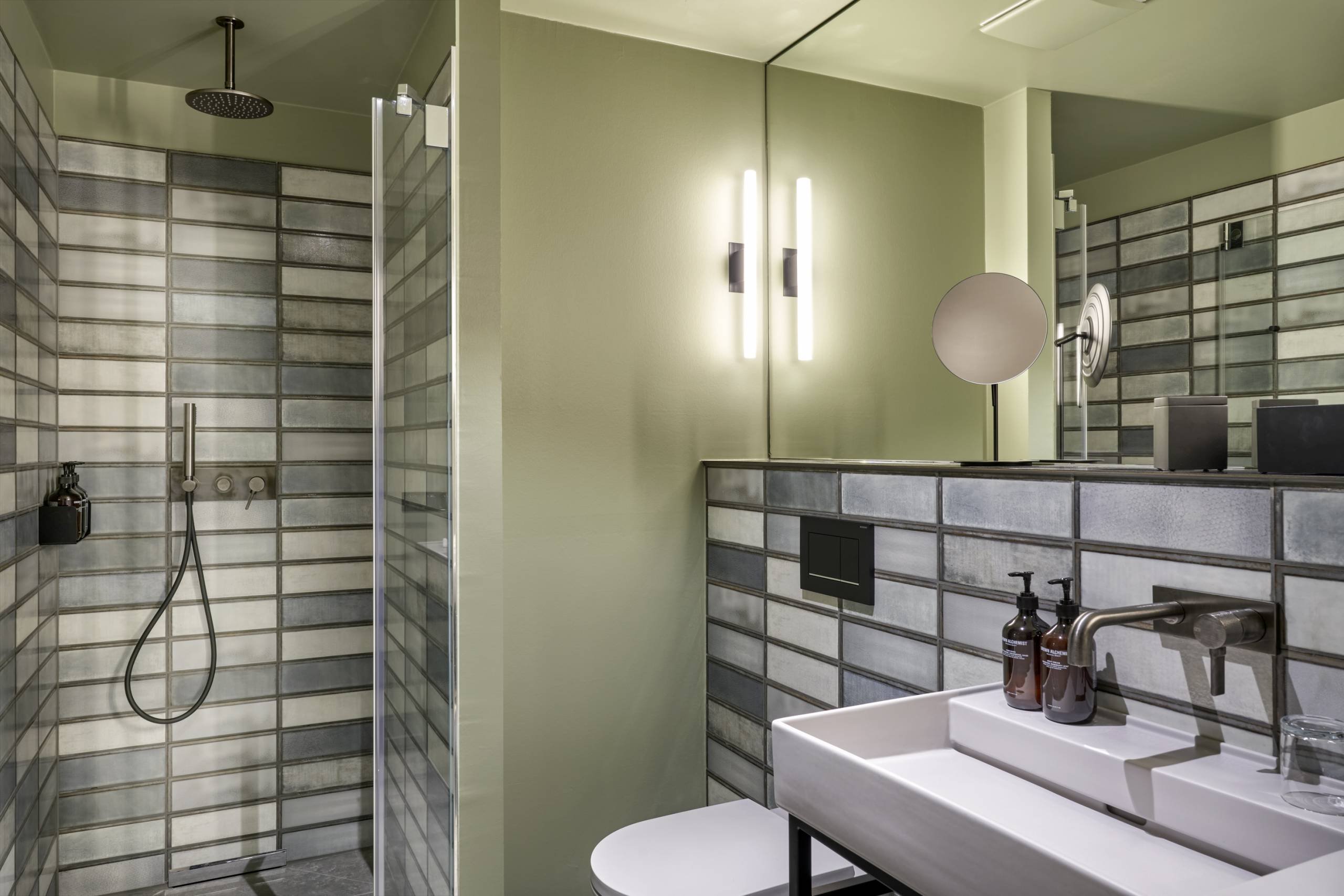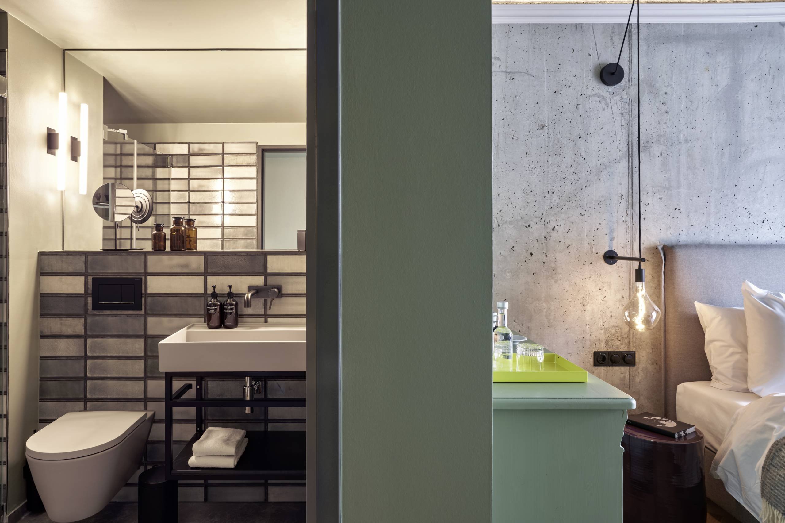 Die Innenarchitekten hatten vom Baddesign eine genaue Vorstellung und wandten sich mit dem Wunsch nach hellgrauer Keramik an das Unternehmen LAUFEN. Passend zum industriellen Beton-Charme der Fliesen und deren unterschiedlichen Grauwerten wurden die Sanitärobjekte farblich individualisiert und eigens für dieses Projekt in mattem Hellgrau produziert. Den Service nennt das Unternehmen „BESPOKE“ und ermöglicht damit maßgeschneiderte Lösungen, die bei Großprojekten immer stärker nachgefragt werden, um eine Markenidentität bis ins Bad sichtbar und erlebbar zu machen. Thomas Tritsch ist zufrieden: „Dank dem BESPOKE-Programm konnten wir die Ausstrahlung des Hauses, die bei einem Hotel ja durchaus ein Markenversprechen ist, subtil im Bad weiterführen.“