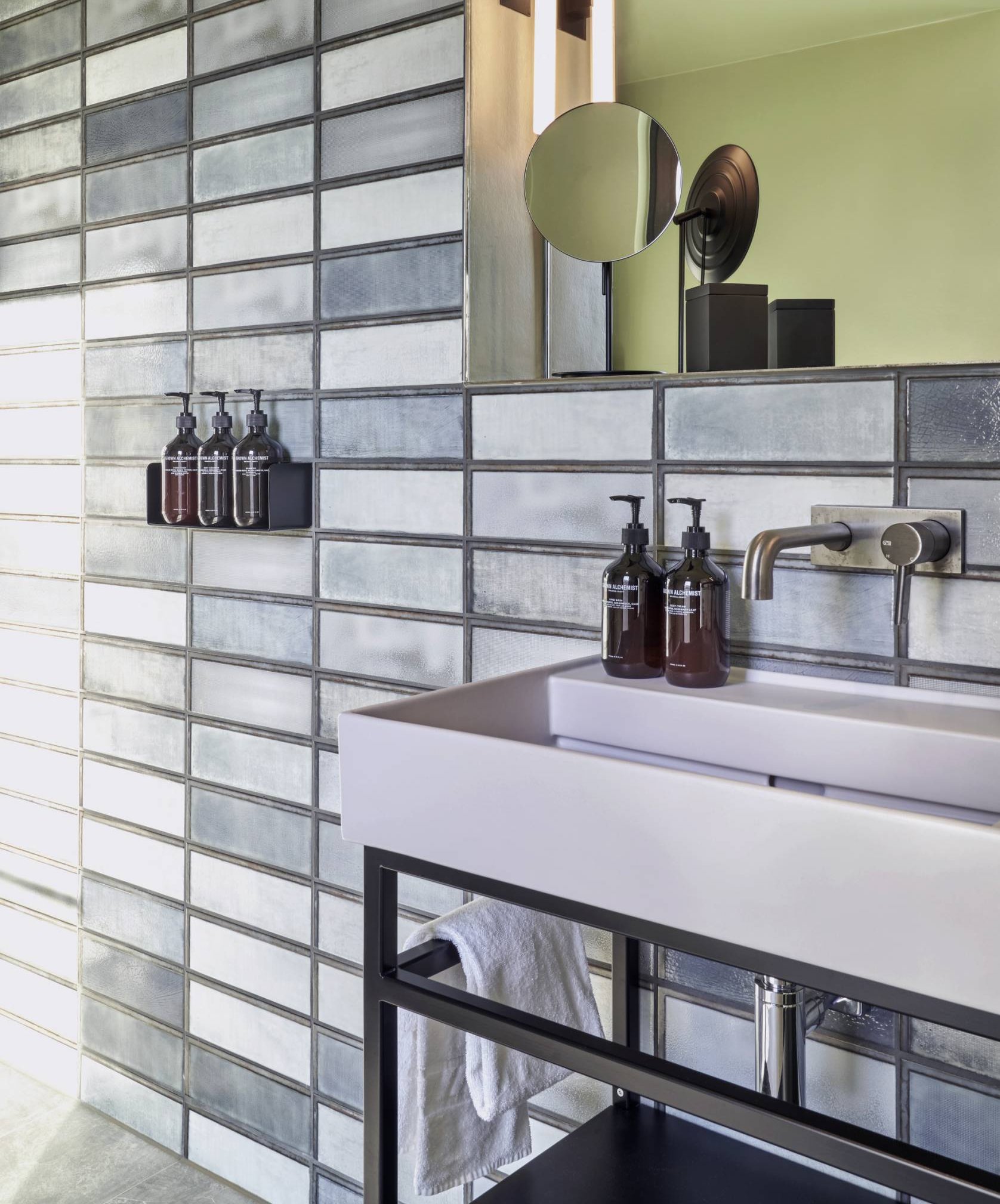 Die klare, geometrische Formensprache der Kartell • LAUFEN Waschtische integriert sich nahtlos in die Architektur der Badezimmer im Gekko House, die von glasbausteinartigen Fliesen dominiert wird. Ein intelligentes Detail dieser Waschtische ist der schmale, umlaufende Rand an den Ablageflächen, der das Überfließen von Wasser verhindert, was dem Housekeeping die Arbeit vereinfacht. Montiert wurden die Waschtische auf schwarzen Metalluntergestellen oder Waschtischkonsolen aus gepulvertem Stahl, was den schlanken Keramikobjekten Leichtigkeit und Eleganz verleiht und die Rechtwinkligkeit der dunklen Fliesenfugen aufgreift. Im gleichen hellgrauen Farbton wie die Waschtische fügen sich die Kartell • LAUFEN WCs in die Raumkomposition ein und vervollständigen mit ihrem konisch nach unten zusammenlaufenden Keramikkörper das Bild.