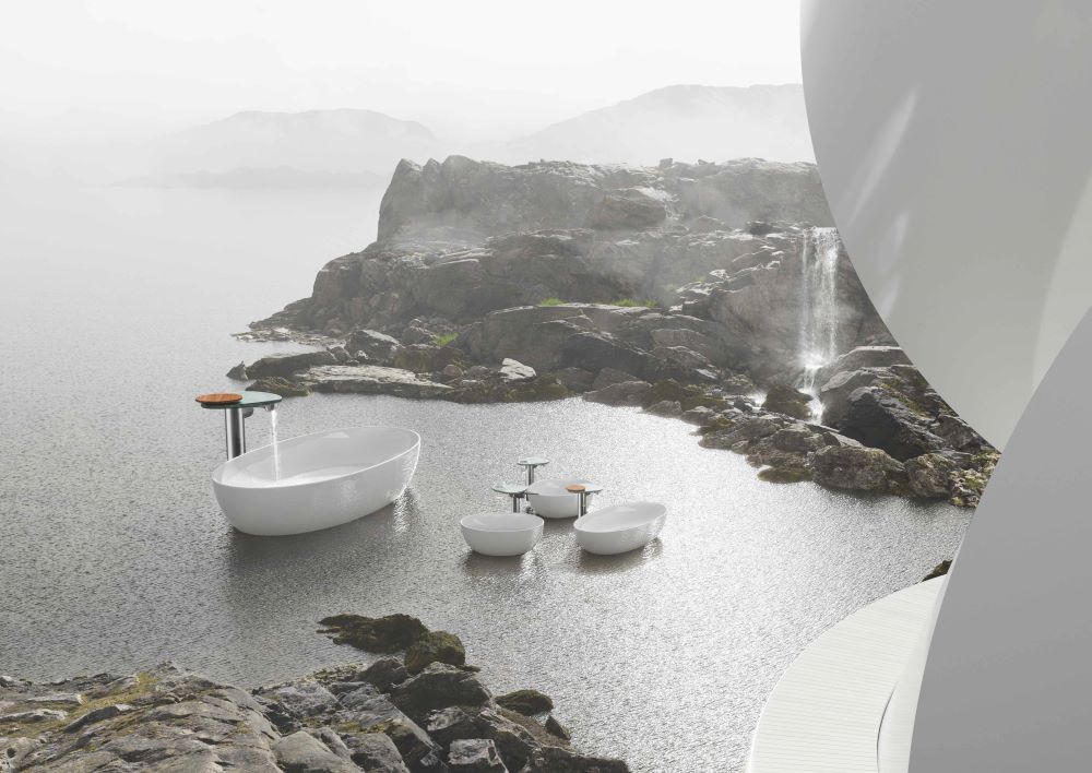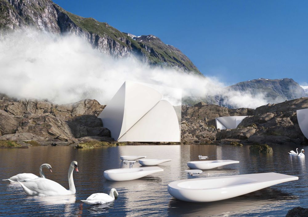 Zur Feier der Neuauflage von ILBAGNOALESSI beauftragte LAUFEN Snøhetta mit der Erstellung von Kunstwerken rund um die ikonische Designkollektion. Bekannt für einen transdisziplinären Ansatz, der Architektur mit Kunst und anderen Design-Disziplinen verbindet, entwickelte das berühmte norwegische Architekturbüro fünf fantasievolle Kompositionen, die die Kollektion in fantastischen Umgebungen, unter unwahrscheinlicher Architektur und majestätischen Landschaften darstellen. Ein Schwan taucht wiederholt in den Bildern auf, seine anmutige Form verweist auf die elegante Designsprache, die die Kollektion charakterisiert, und fordert gleichzeitig die Wahrnehmung von Schönheit, Design und Kunst des Betrachters heraus.